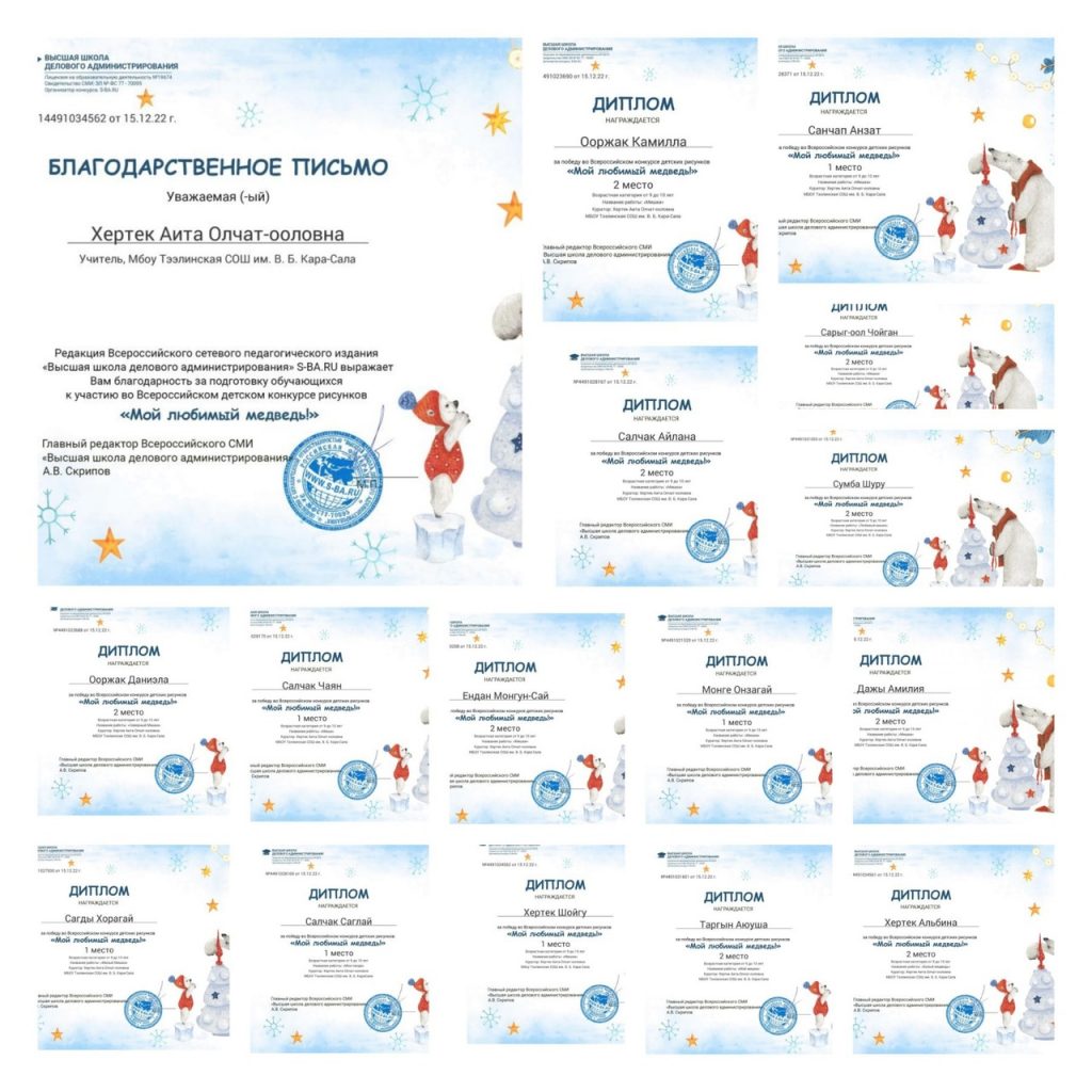 Без рубрики 15 декабря учащиеся 4 «а» класса активно приняли участие во всероссийском конкурсе рисунков «Мой любимый медведь». Победителями стали 6 учащихся, призеров 8. Охват: 14 учащихся. Классный руководитель Хертек А.О. 29.12.2022 /