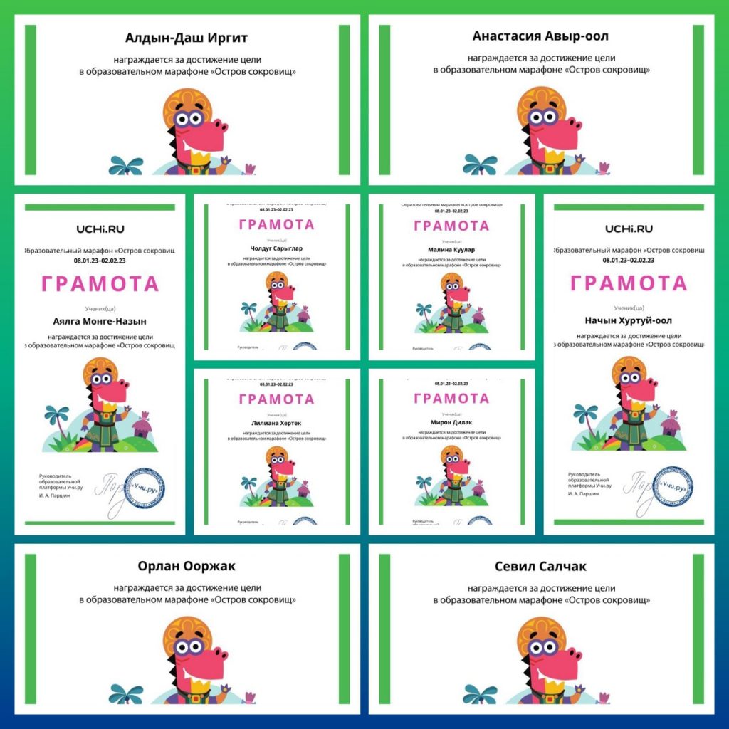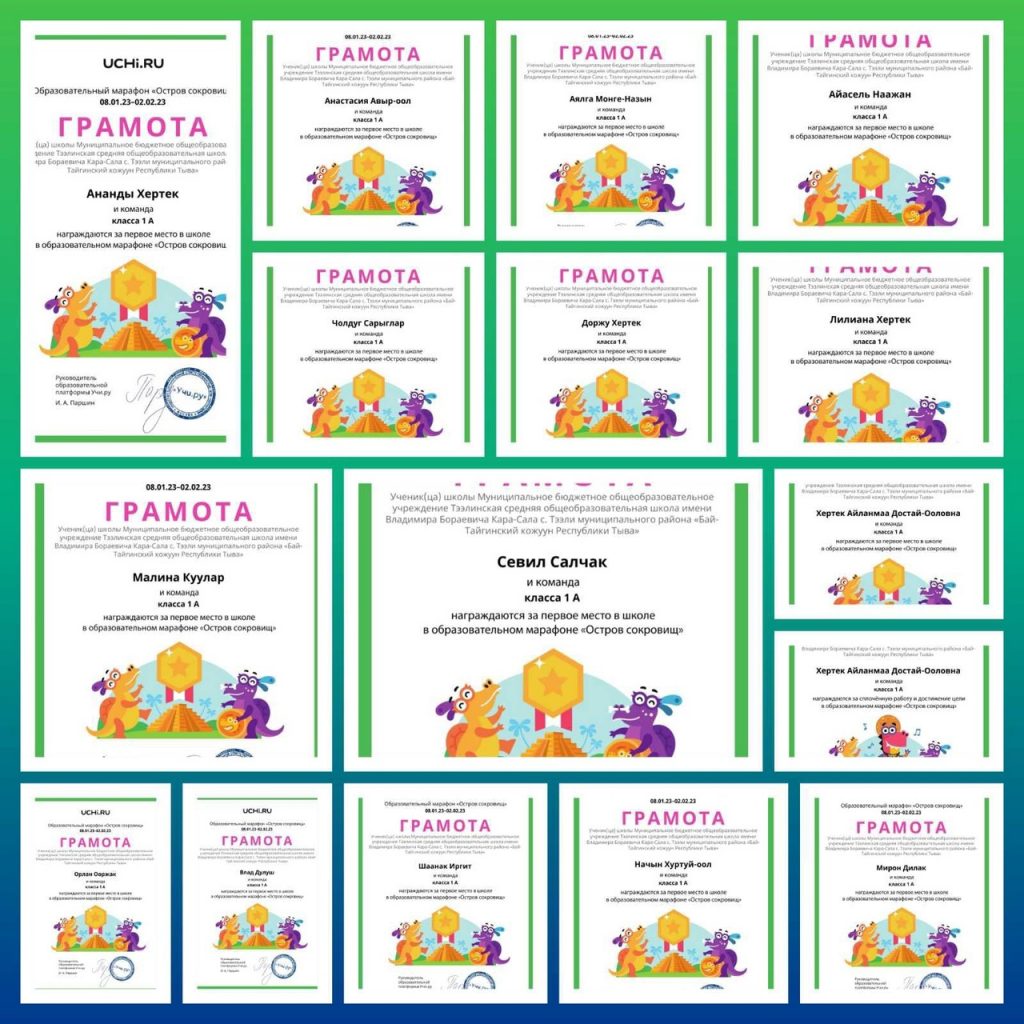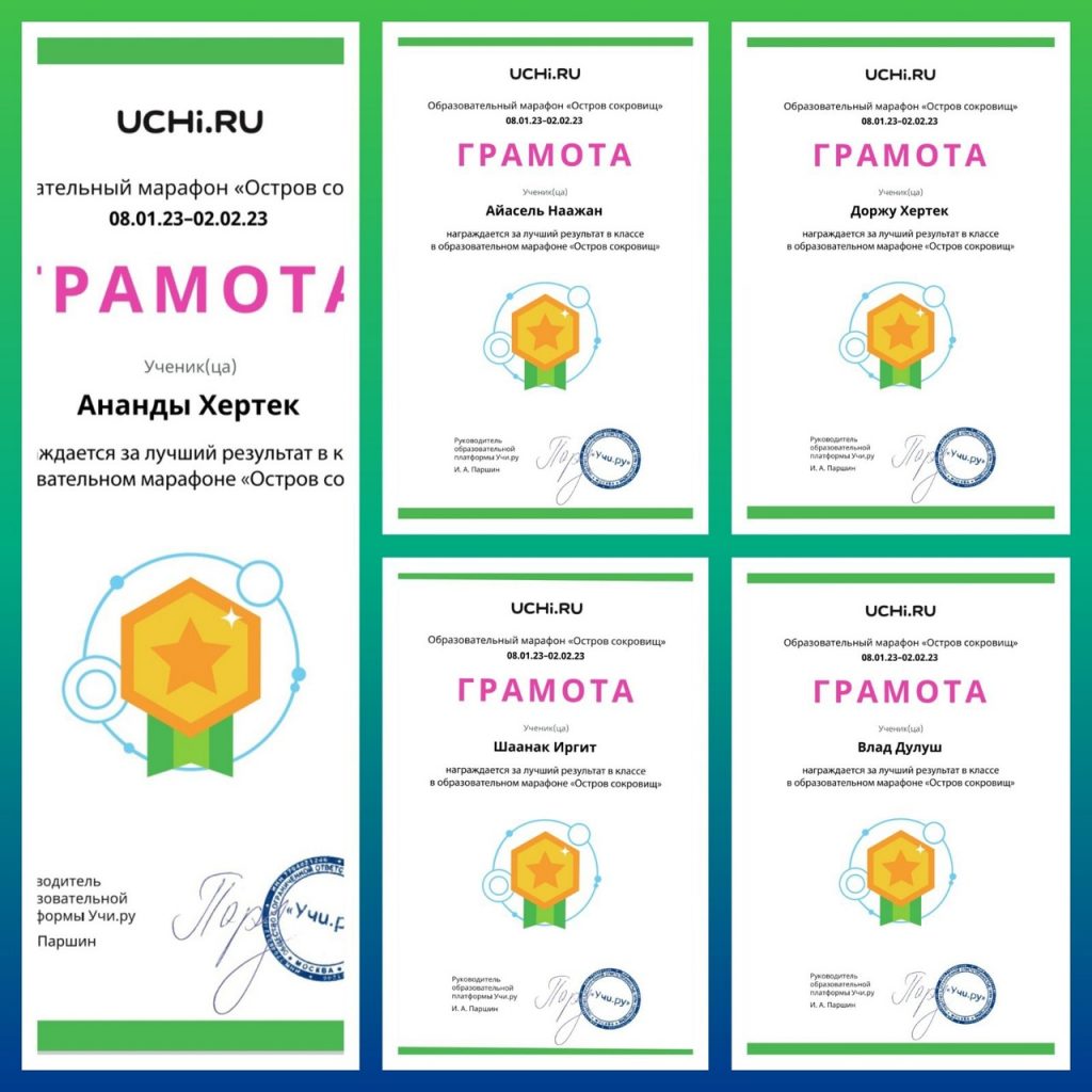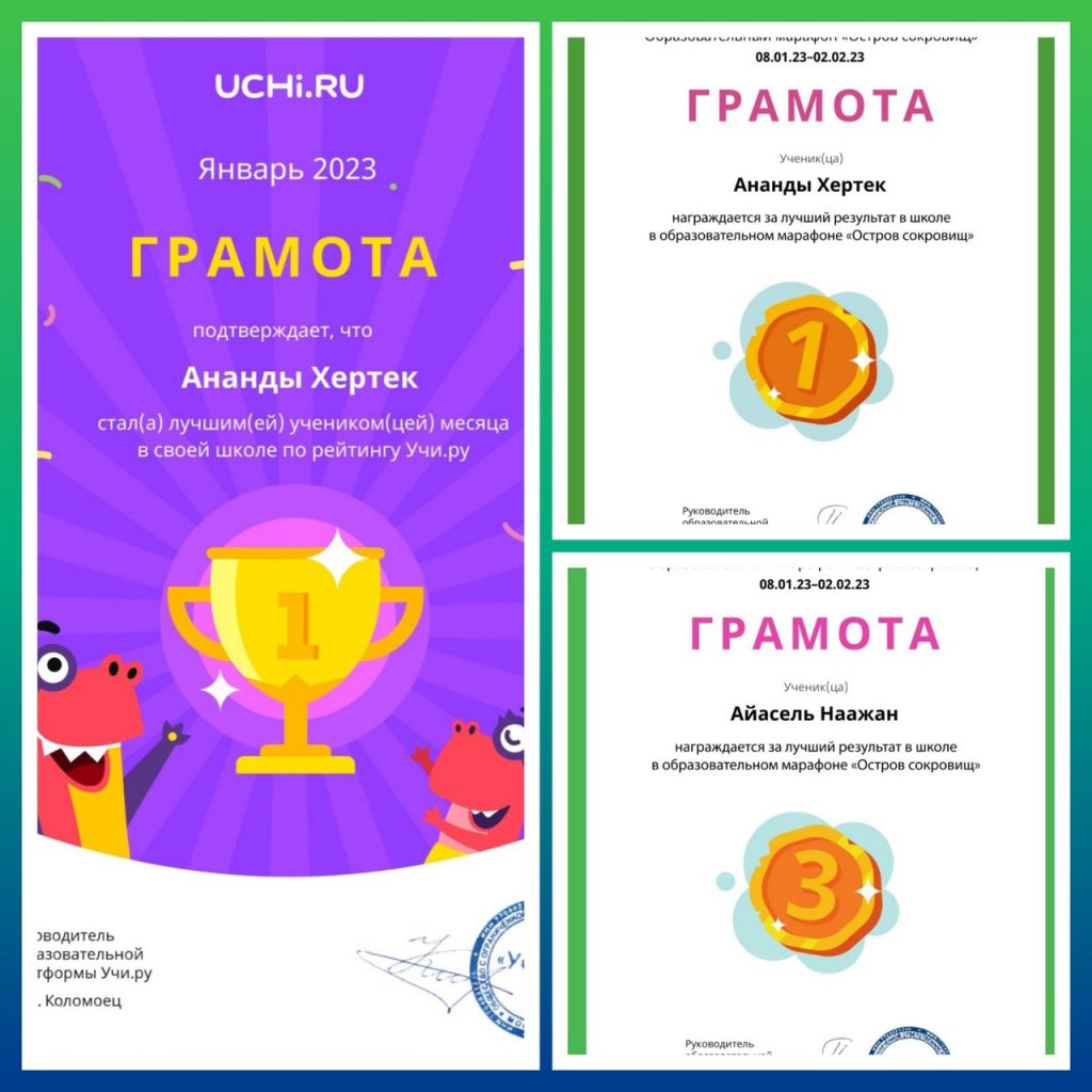 Учащиеся 1 а класса приняли участие в образовательном платформе-марафоне «Остров сокровищ», который проводил платформа Учи.ру. с 08.01.23г по 02.02.23г. В интеллектуальном мероприятии они заняли 1 место, набрав 884 баллов. Лидерами стали: Хертек Ананды, Наажан Айасель, Дулуш Влад, Хертек Доржу, Иргит Шаанак. Лучший результат в школе показали: Хертек Ананды (1место), Наажан Айасель (3 место). Также Хертек Ананды стал лучшим учеником школы за январь месяц. Классный руководитель Хертек Айлаңмаа Достай-ооловна.