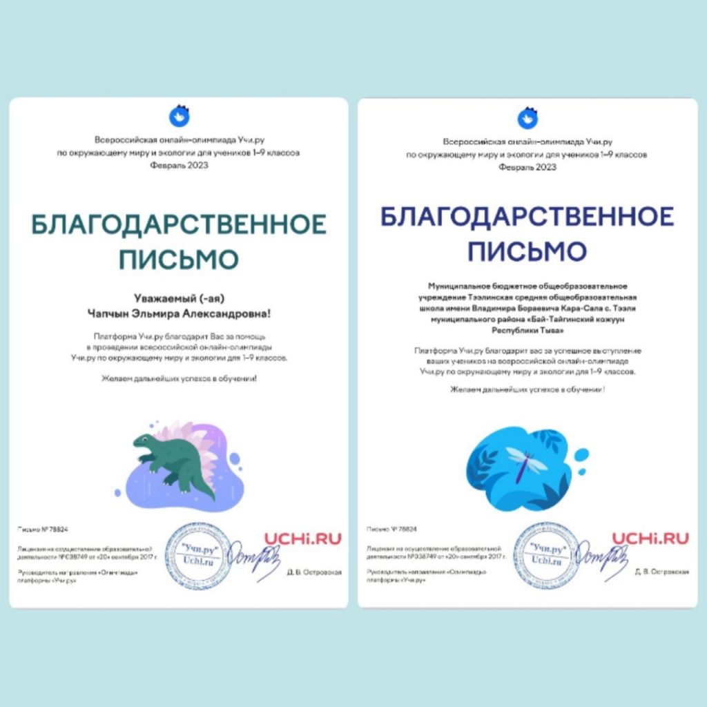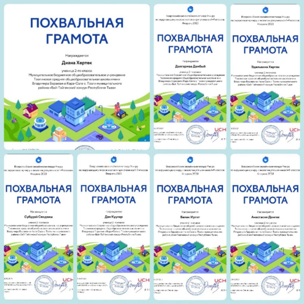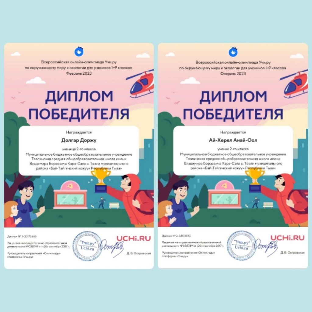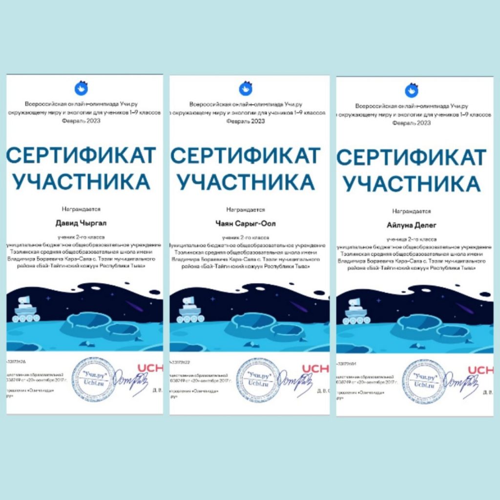 С 31 января по 27 февраля 2023 года для учеников 1–9 классов проведена олимпиада на образовательной платформе «Учи.ру» по окружающему миру и экологии. Обучающиеся 2 «а» класса Тээлинской СОШ им.В.Б.Кара-Сала с большим интересом участвовали в олимпиаде. В итоге стали победителями и призерами. Все участники олимпиады награждены дипломами и грамотами, а также сертификатами участия. Классный руководитель Чапчын Э.А. Охват: 12 учащихся.