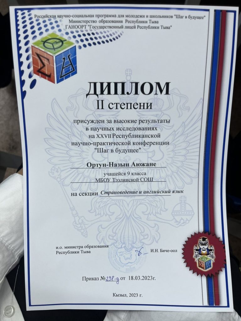 Учащейся 9 «а» класса, МБОУ Тээлинской СОШ им.В.Б.Кара-Сала Ортун-Назын Аюжанне присужден Диплом II степени, за высокие результаты в научных исследованиях на XXVII Республиканской научно-практической конференции «Шаг в будущее» на секции » Страноведение и английский язык». Научный руководитель Сендажы Шончалай Санчай-ооловна, учитель английского языка.