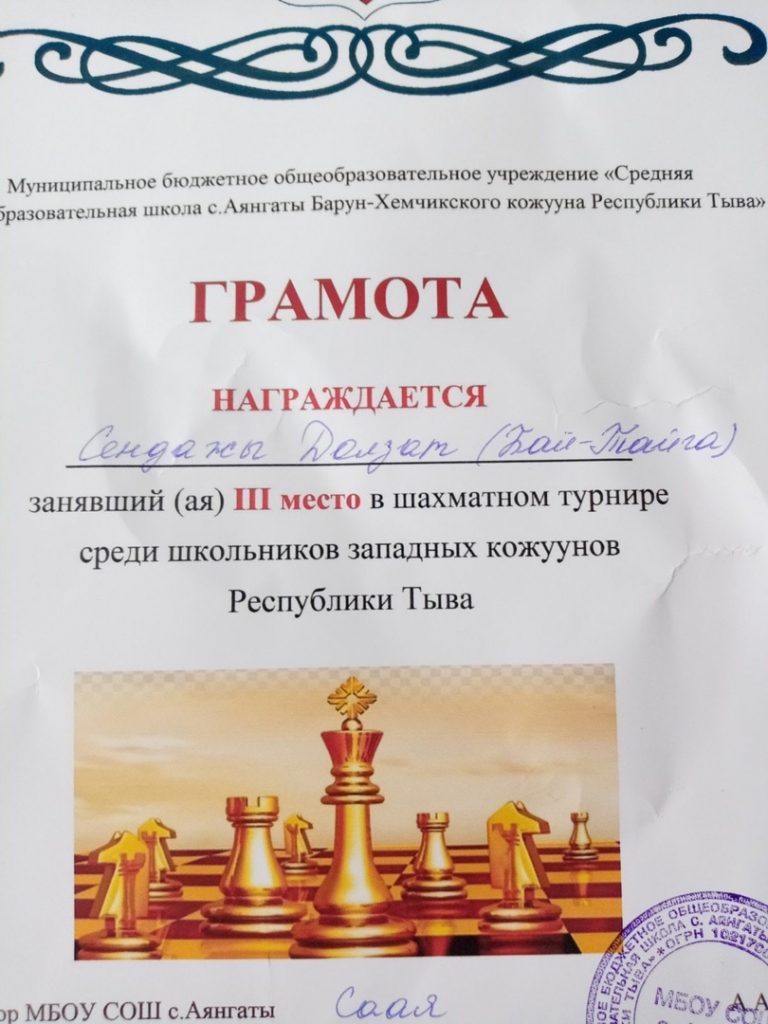 15 апреля в МБОУ СОШ с.Аянгаты прошёл рейтинговый турнир по шахматам среди учащихся 5-11 классов западных кожуунов Республики Тыва. В турнире приняли участие 70 учащихся. Среди девушек 3 место заняла ученица МБОУ СОШ с.Тээли Сендажы Долзат 8а класс. В Российскую Федерацию Шахмат г.Москва направлены результаты турнира для получения ID номера и рейтинговых баллов 26 мальчикам и 10 девочкам. Среди них учащиеся МБОУ Тээлинская СОШ Артына Рустам 6б кл, Сюрюн Санчай 8г кл, Сендажы Ачыты 9б кл, Сендажы Долзат 8а кл, Артына Марджана 5в кл. #Шахматы
